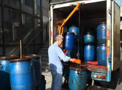 這些廢油被盛放在油桶內,飯店工作人員把油桶搬運到后門挨著的馬路上后,回收公司的司機再操控車上安裝好的車載吊運機,把一桶桶油吊裝到貨車車廂內,既省力又無需直接和廢油桶接觸,干凈衛生。